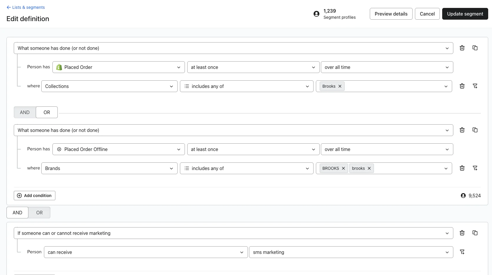 You’ll see exactly how many customers match that criteria — 1,239 people who have purchased Brooks and are opted into SMS.