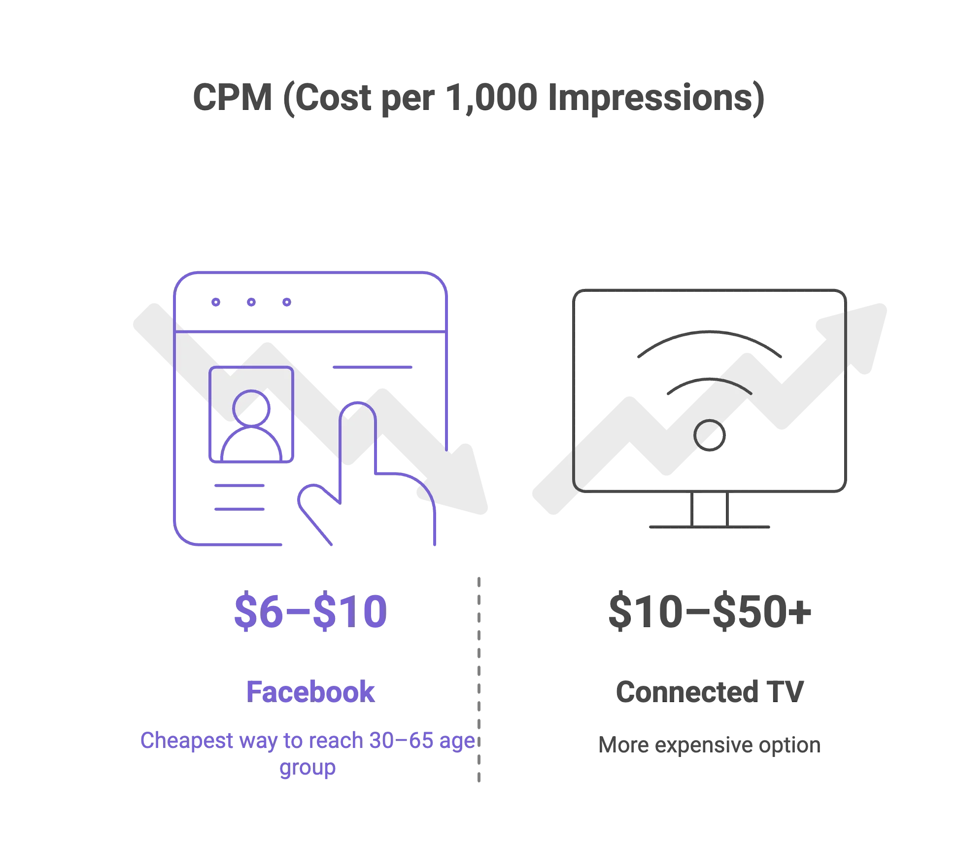 Connected TV (CTV) CPM: $10–$50+ (source)